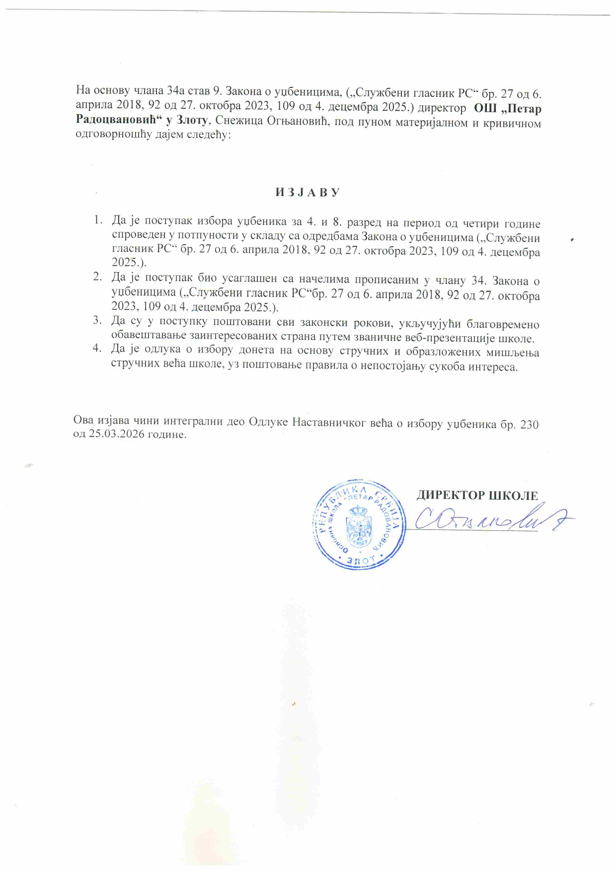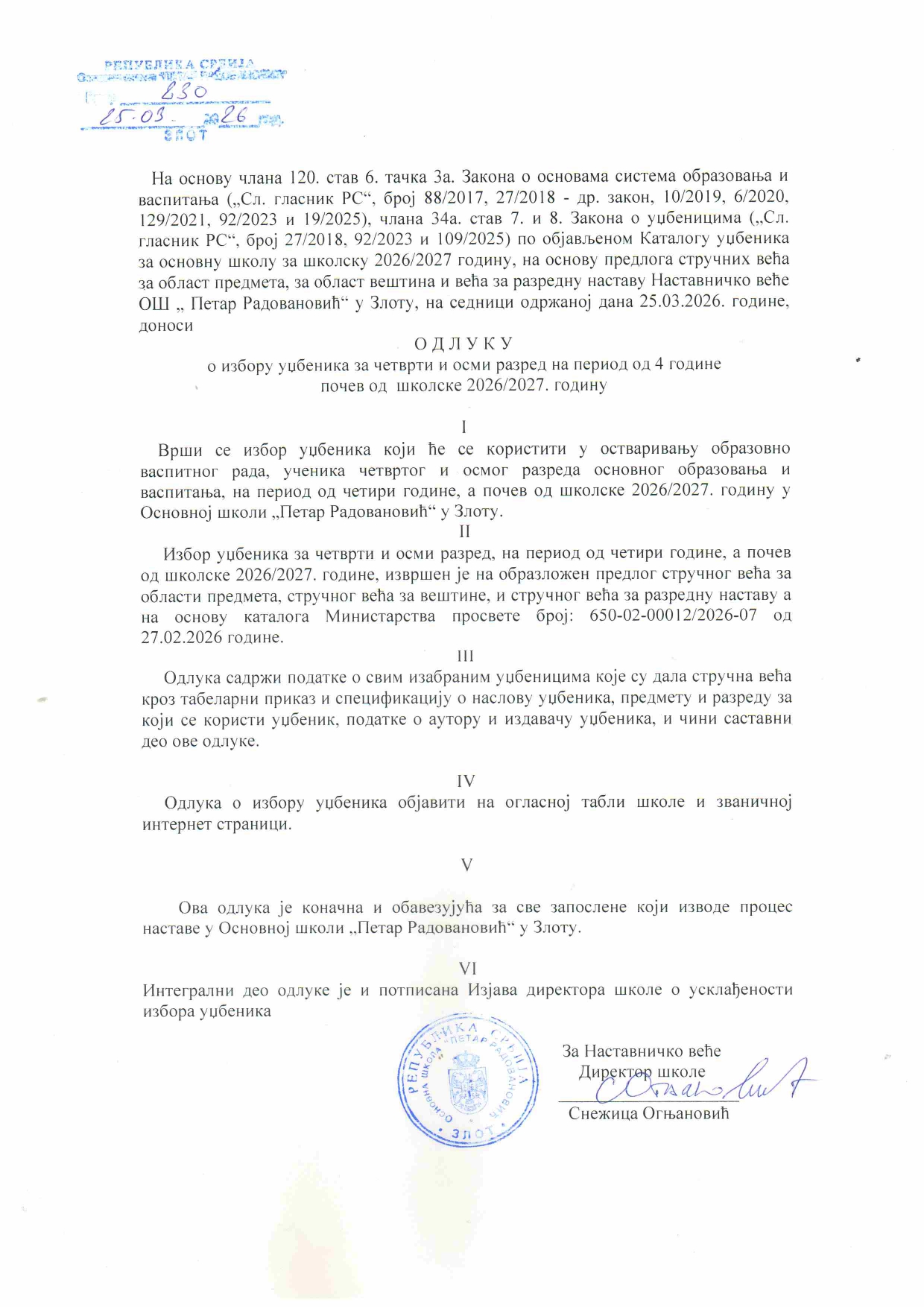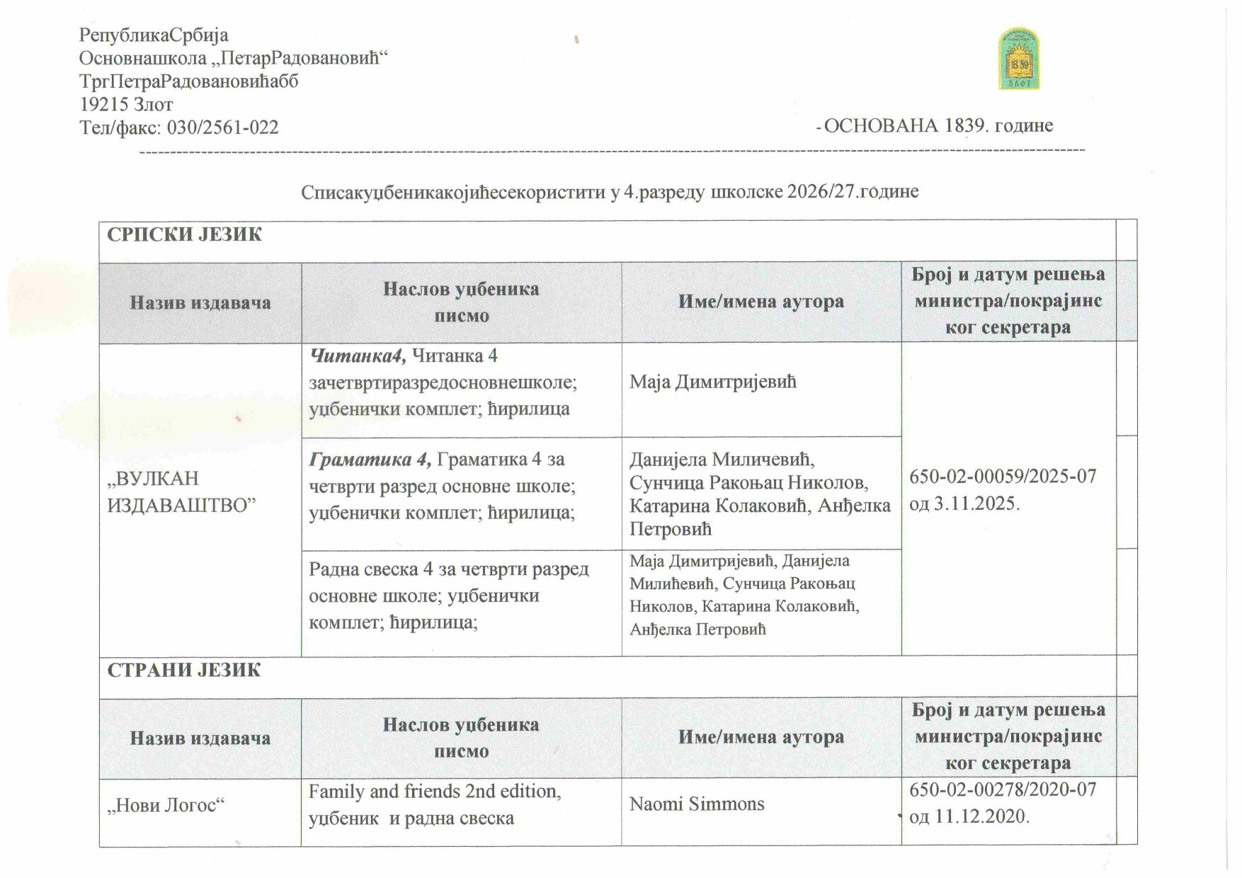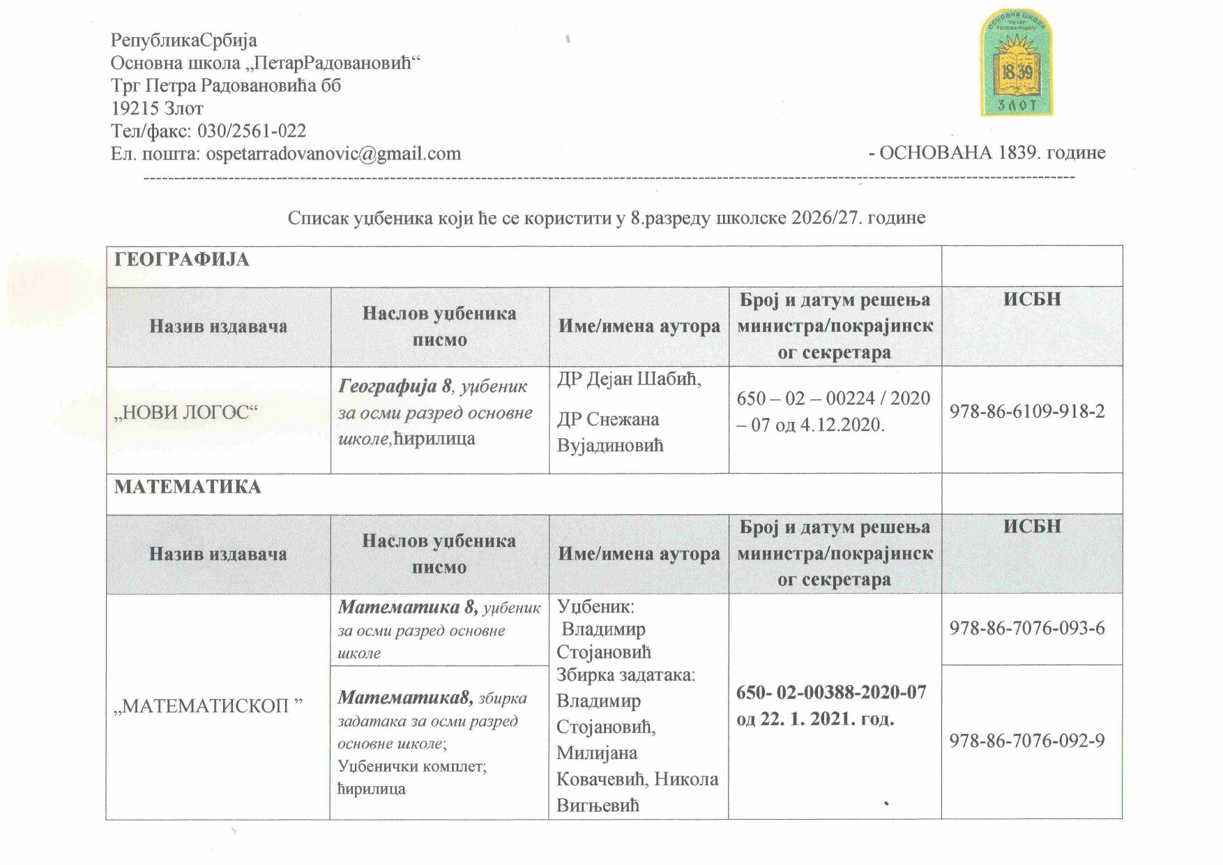 Наш лого Скорашњи чланци Одлука о избору уџбеника Одлука о процедури избора уџбеника Галерија Дан отворених врата Документа школе Насловна Новости Распоред осталих активности Распоред писмених и контролних Распоред часова` Распоред школског звона Такмичења Архива КатегоријеКатегорије Изабери категорију Документа школе (2) Информације (2) ПРАТИТЕ НАС април 2026. П У С Ч П С Н 12345 6789101112 13141516171819 20212223242526 27282930 « мар Адреса ОШ “ПЕТАР РАДОВАНОВИЋ” Трг Петра Радовановића бб 19215 Злот Контакт телефон: 030 25 61 919 030 25 61 022 e-mail: [email protected] Одлука о избору уџбеника